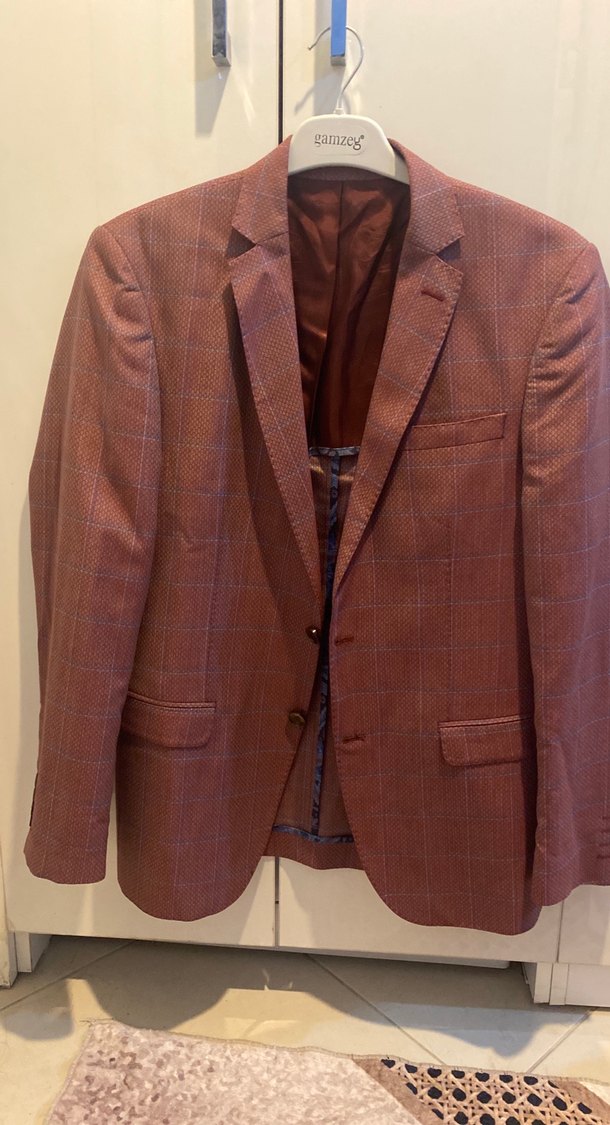 Bordo renkli, parlak görünümlü, düğmeli ve normal kesim erkek takım ceketi. Uzun kollu ve klasik tarzda, ofis için uygundur.