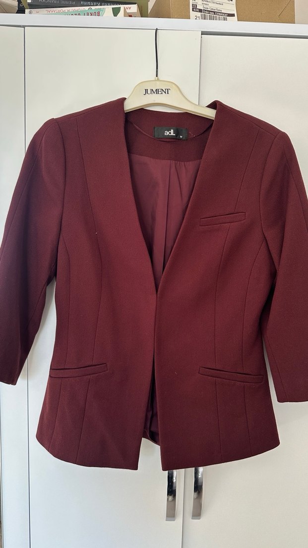Bordo renkli, yakalı ve düğmeli kadın blazer ceket. Ofis için modern klasik tarzda şık bir parça. Ürün çok az kullanıldı. Yarım kol. Bir kusuru yoktur. Kalıp dar.