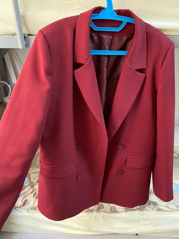 Düğmeli, parlak bordo renkte kadın blazer ceket. Normal kesim, uzun kollu ve midi boyda. İş ve sokak stili için uygun, sentetik kumaştan üretilmiştir. kusuru yok