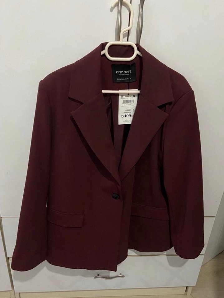 Bordo renkli, düğmeli, uzun kollu, normal boyda kadın blazer ceket. Ofis ve günlük kullanıma uygun, düğmesiz ve sade tasarımlı, sentetik kumaştan üretilmiştir.