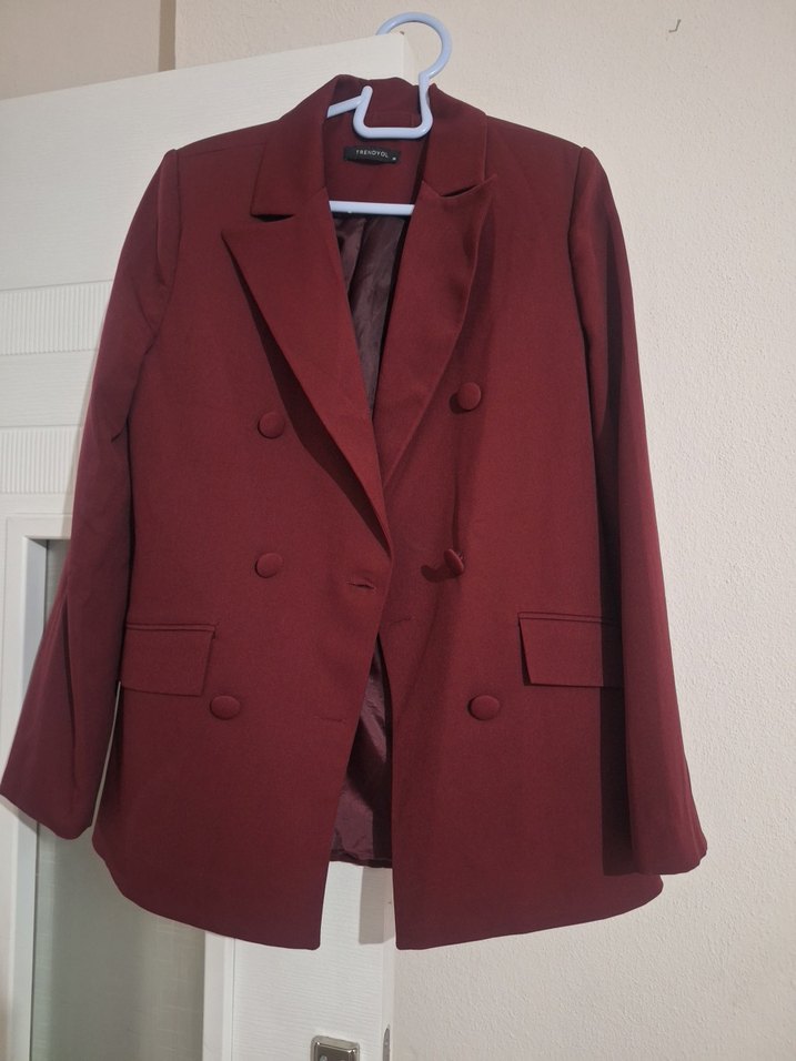 Bordo renkli, düğmeli, normal kesim kadın blazer ceket. Notlu yaka, uzun kollu ve midi boyda. Ofis ve günlük şıklık için uygun, düz desensiz ve sentetik kumaştan yapılmıştır.