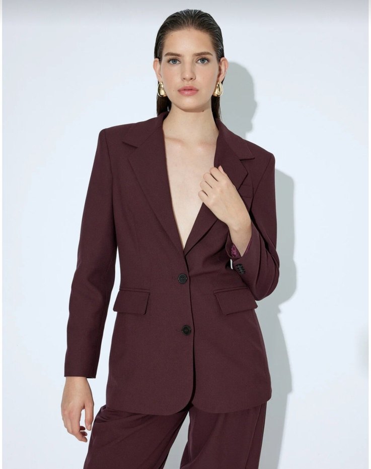 Bordo renkli, düğmeli, keskin yakalı kadın blazer ceket. Uzun kollu, midi boy ve düzgün kesime sahip, sentetik kumaştan üretilmiştir. Ofis için çağdaş tarzda. Hiç kullanılmadı çok şık bir cekettir.