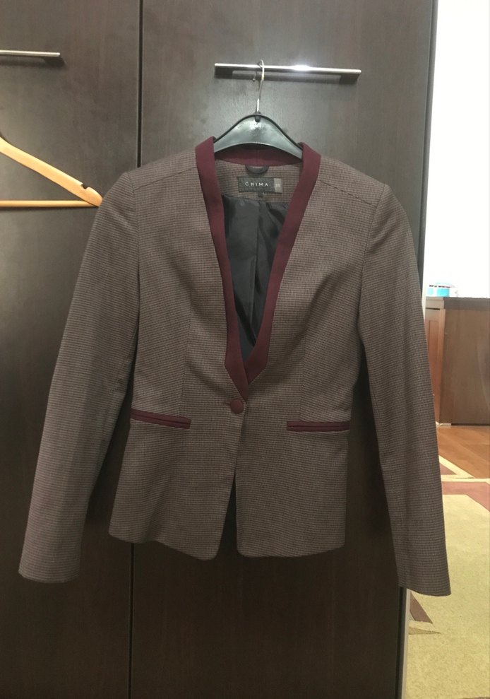 Bordo düğmeli, uzun kollu kadın blazer ceket. Pötikare normal boyda astarlı şık ve zarif ve klasik modern tarzda, iş ortamı için uygundur.