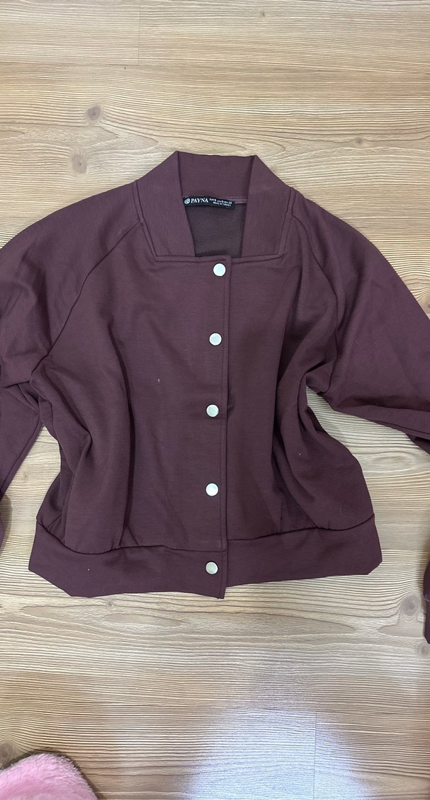 Bordo renkli, düğmeli, uzun kollu, bol kesim kadın ceket. Yumuşak ve sıcak dokulu, günlük kullanıma uygun bir parça.
