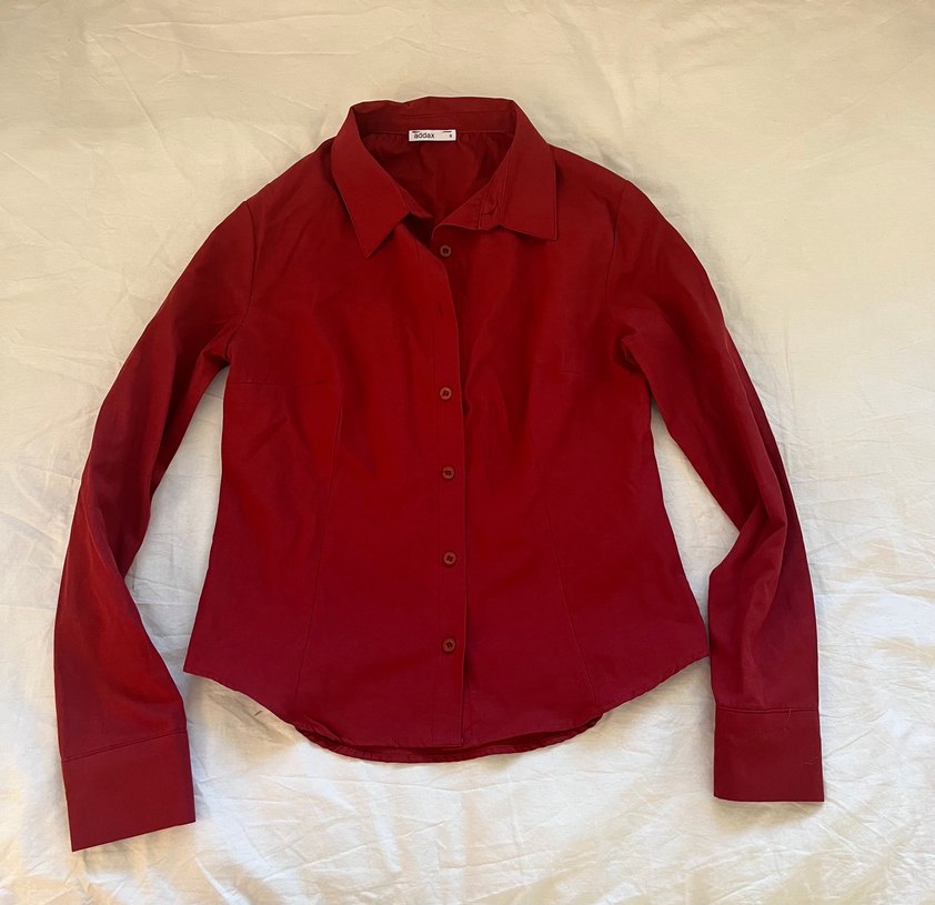 Bordo renkli, düğmeli, uzun kollu ve yakalı kadın gömleği. Normal boyda ve parlak dokuludur, ofis için uygundur.