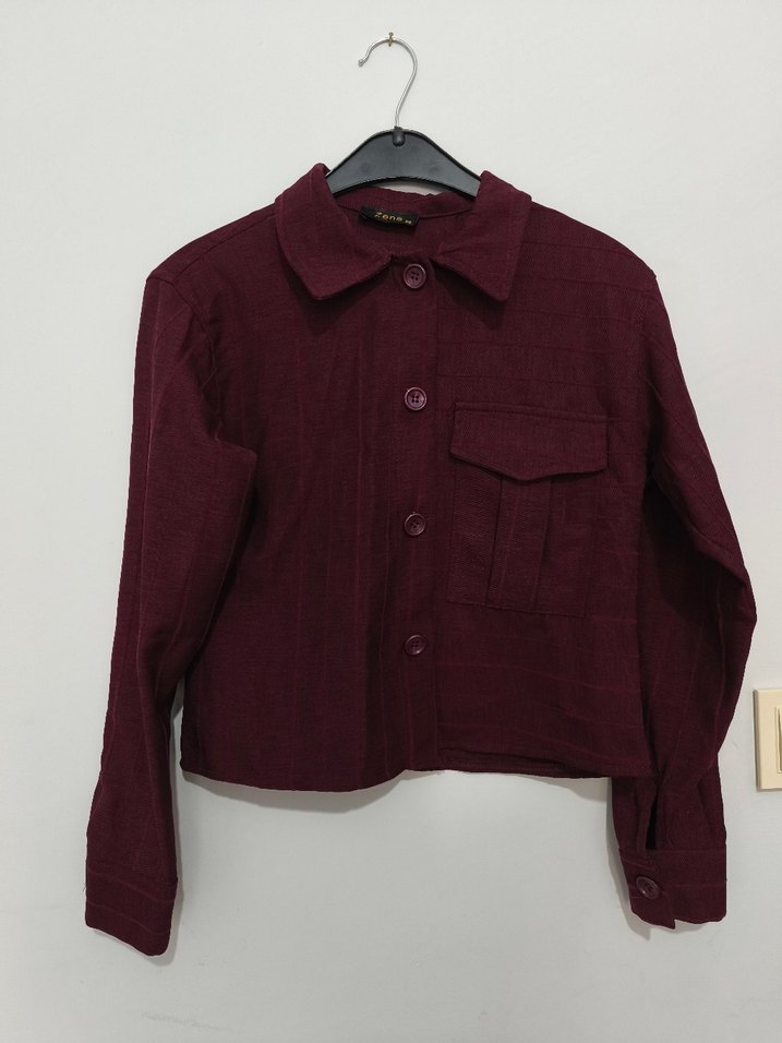 Bordo renkli keten kadın gömlek, uzun kollu, düğmeli ve yakasında kesik detay bulunur. Normal boy ve rahat kalıptadır, günlük kullanıma uygundur.
