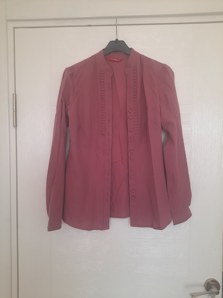 Bordo renkli, uzun kollu, düğmeli kadın gömlek. , notched lapel yakalı, normal kesim, minimalist ve normcore tarzda, ofis için uygun.