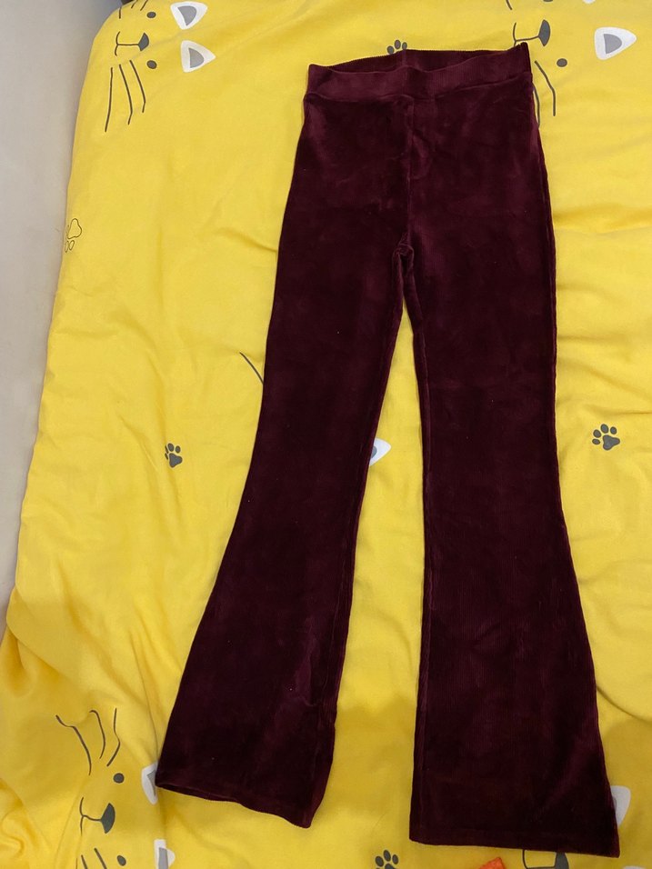 Bordo renginde, düğmeli ve ispanyol paça kesim, fit kesim sentetik kumaştan kadın pantolon. Günlük rahat ve şık bir tercih.