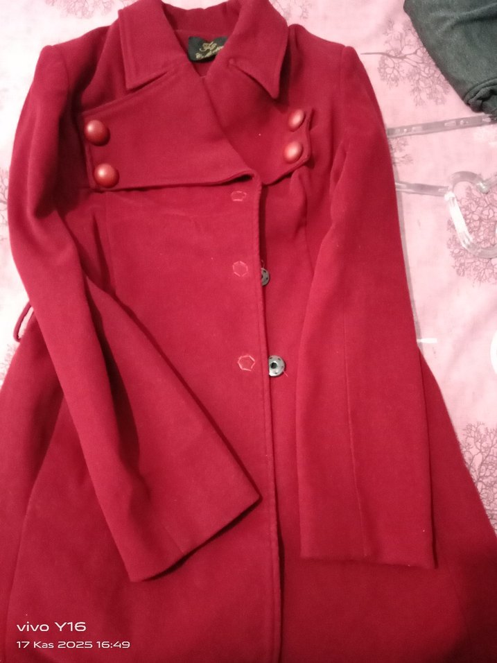 Bordo renkli kaban, düğmeli ve kesik yaka detayına sahiptir. Yumuşak ve sıcak kumaştan üretilmiş, rahat kesimdir. Günlük sokak stiline uygundur. ✨ 90 cm boyu. astarlı. çok az kullanıldı. herhangi bir arızası yok. marka öne çıksın diye yazıldı. Sefamerve ürünüdür
