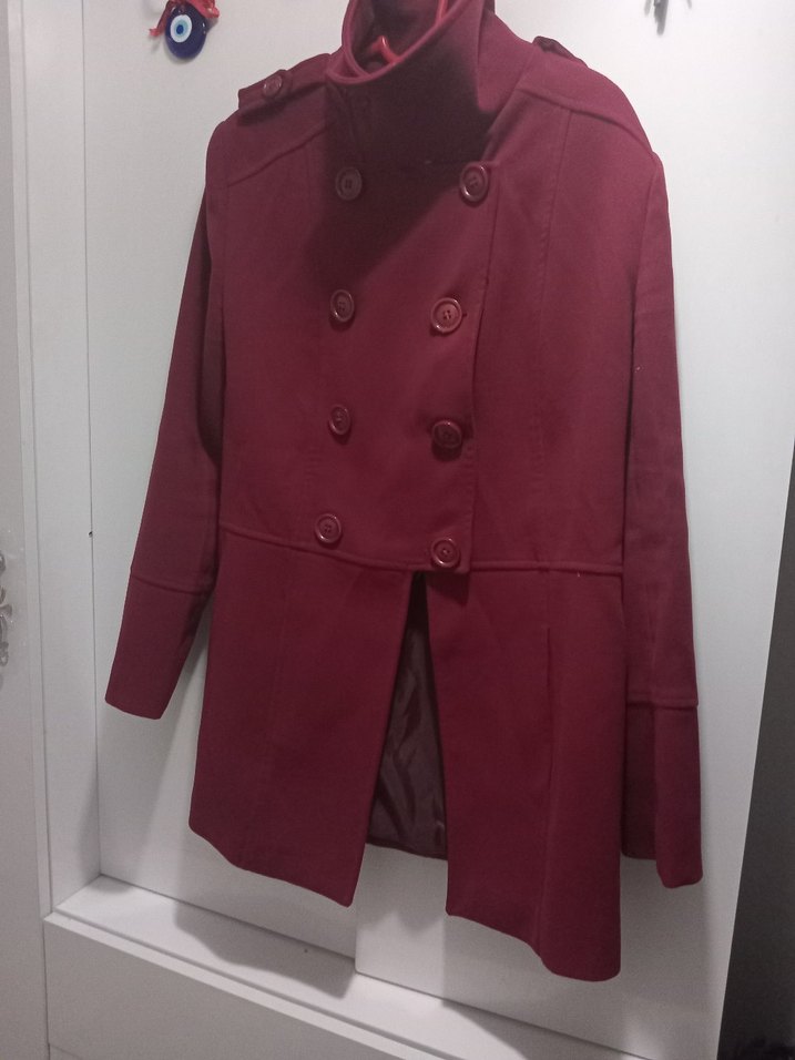 Bordo renkli kadın kaban, çift düğmeli ve yüksek yakalı. Uzun kollu ve şık kesimli, soğuk havalar için uygun. t