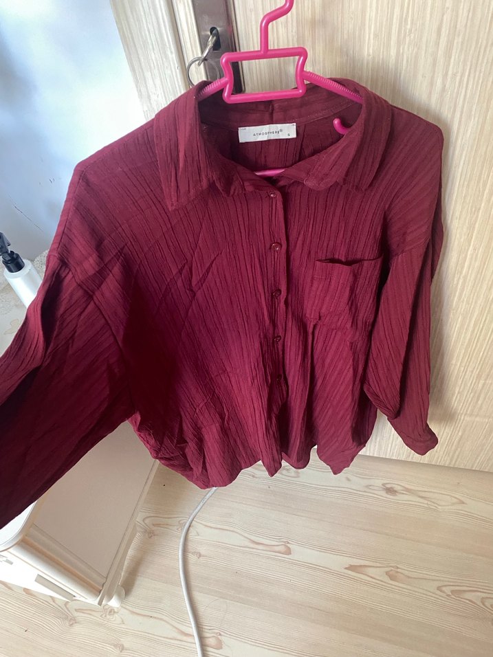 Bordo renkli, düğmeli, keten kumaştan yapılmış, uzun kollu, yakalı, bol kesim kadın gömleği. Günlük rahat kullanım için uygundur.