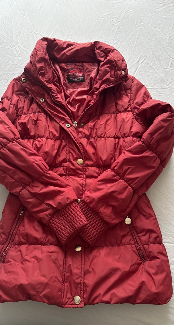 Parlak bordo renkte, düğmeli ve normal boyda kadın kışlık mont. Notch yaka ve uzun kollu, sentetik kumaştan, rahat sokak stili için uygun.