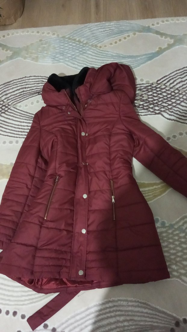 Bordo renkli, düğmeli ve notched lapel yakalı, sentetik kumaştan yapılmış, midi boy, fitted kesim kadın kışlık mont. Rahat ve günlük kullanıma uygun. ✨