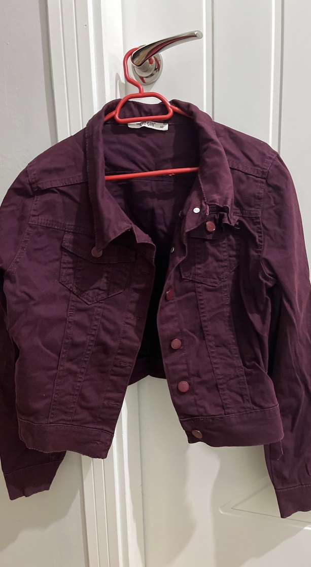 Bordo renkli, düğmeli ve normal miniboyda, uzun kollu, oturan kesime sahip kadın kot ceketi. Suni kumaştan üretilmiş, günlük sokak giyimine uygun.