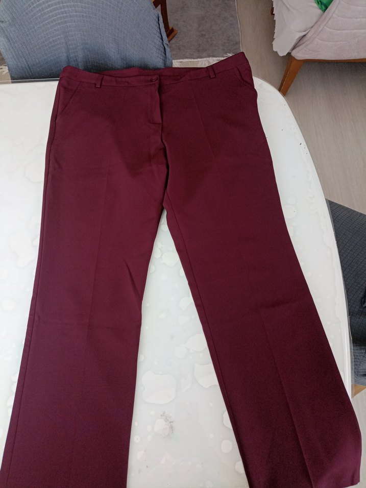Bordo renginde, düğmeli detaylı, parlak görünümlü, normal boy midi kesim, rahat kalıp kumaş pantolon.