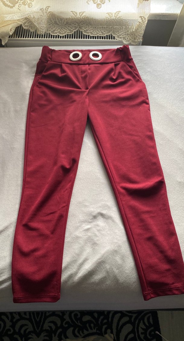 Bordo renkli, sentetik kumaştan yapılmış, düğmeli ve normal midi boyda, rahat kesimli kadın pantolonu. Günlük sokak stiline uygundur.