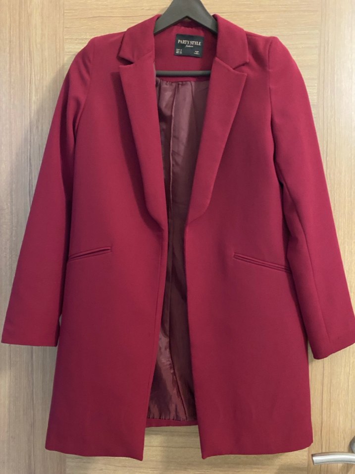 Bordo renkli, düğmeli, normal boy midi blazer ceket. Uzun kollu, keskin yakalı ve parlak görünümlüdür. Ofis ve iş ortamları için uygundur. Temizdir yırtığı söküğü yoktur.