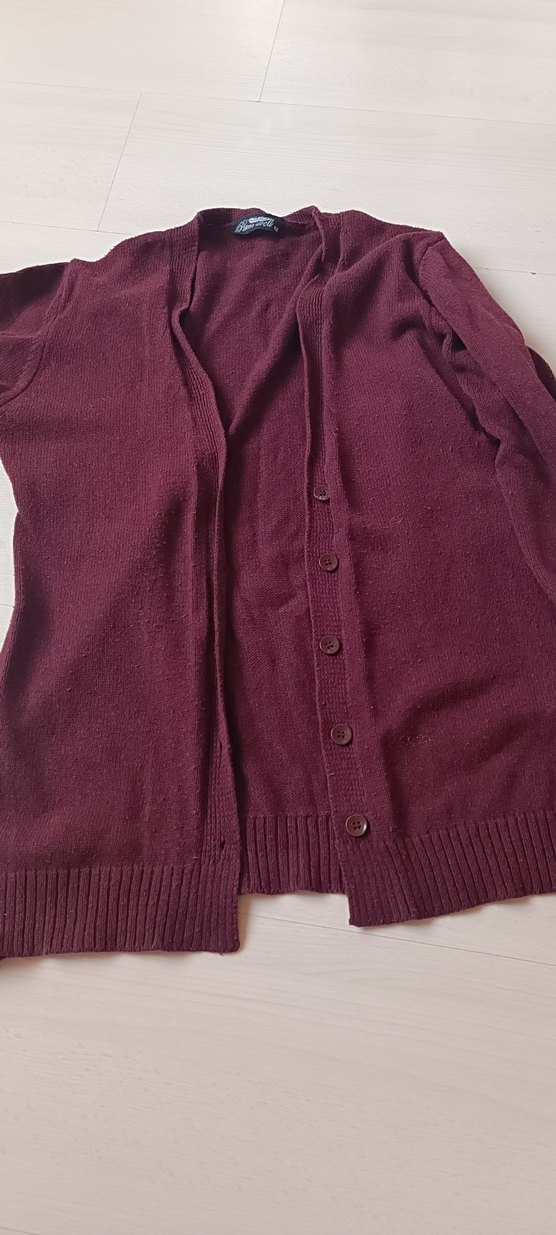 Kadınlar için bordonun sıcak tonunda, düğmeli ve uzun kollu yumuşak yün hırka. Rahat kesim ve normal midi boyda, günlük kullanıma uygundur.