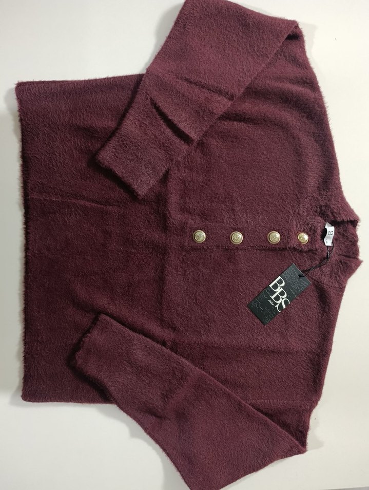 Bordo renkli, düğmeli, uzun kollu ve yuvarlak yakalı kadın sweatshirt. Yumuşak ve sıcak kumaştan, bol kesim ve midi boyda, rahat sokak stili için uygundur.