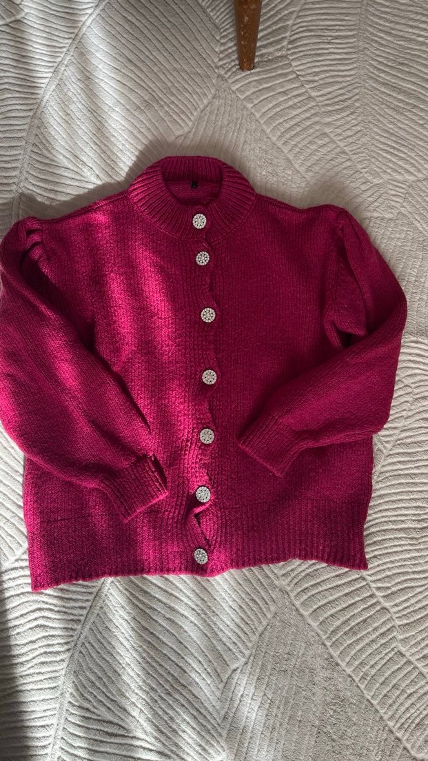 Bordo renkli, parlak görünümlü uzun kollu triko hırka. Düğmeli, bisiklet yaka, bol kesim ve midi boyda, rahat ve şık bir tercih.