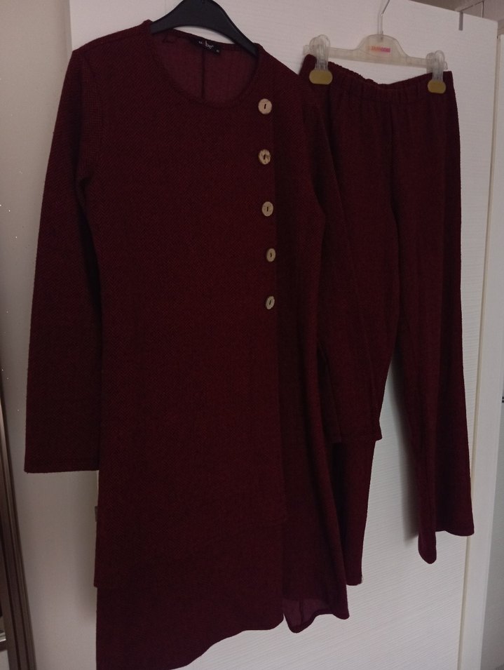 Bordo renkli, düğmeli detaylara sahip uzun kadın takım Yün kumaştan, uzun kollu ve kesimli yakalı, ofis kullanımı için uygundur. likralı triko takım