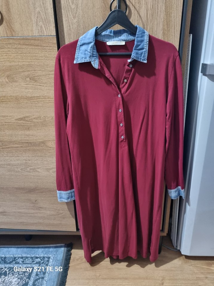 Bordo tunik veya midi elbise olarak da kullanılabilir, uzun kollu ve düğmeli, yakasında kot detaylı yakasıyla dikkat çekiyor. Rahat kesim ve sentetik kumaştan, günlük kullanım için uygundur.