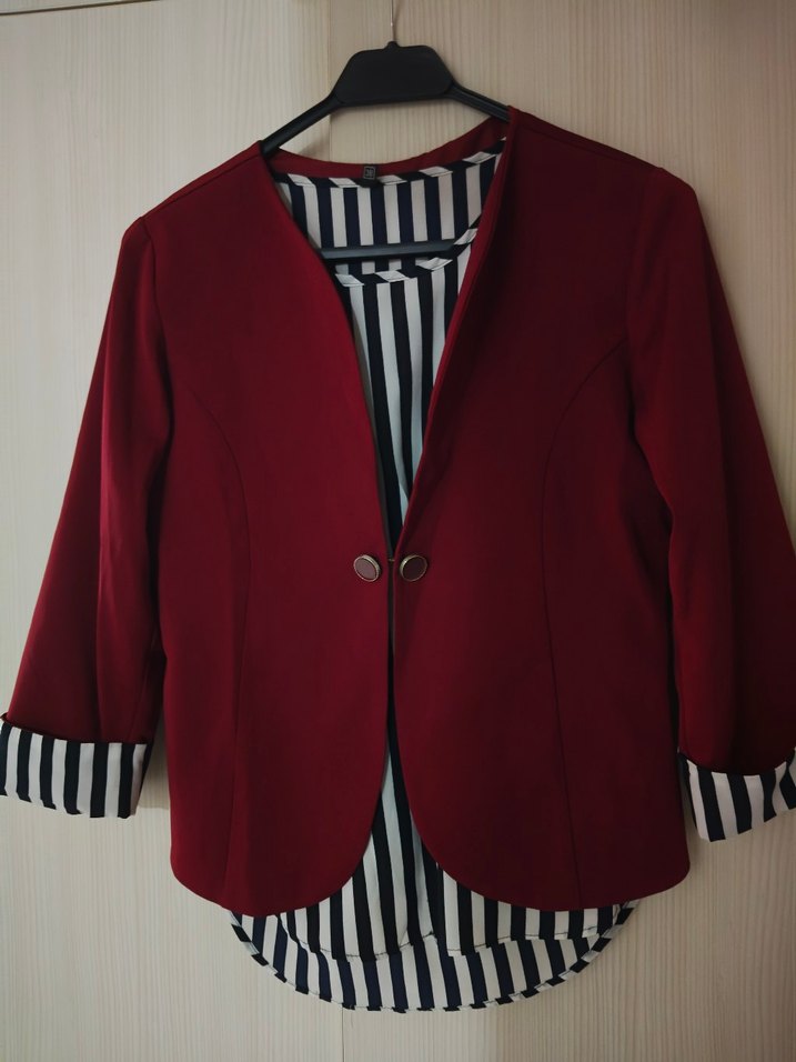 Bordo renkli kısa kesim, düğmeli ve uzun kollu kadın blazer ceket. Ofis ve günlük sokak stiline uygun. 2 kez kullanıldı. 38 Bedendir.