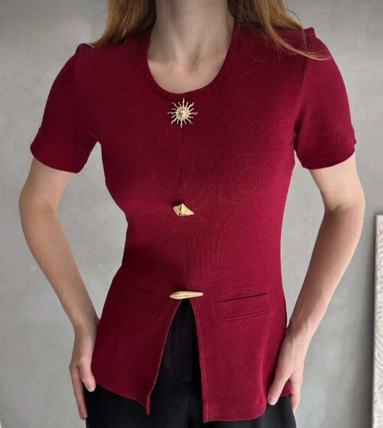 Bordo, düğmeli, kısa kollu, normal uzunlukta, şık bluz. Günlük kullanıma uygun klasik ve çağdaş tarzı yansıtır.