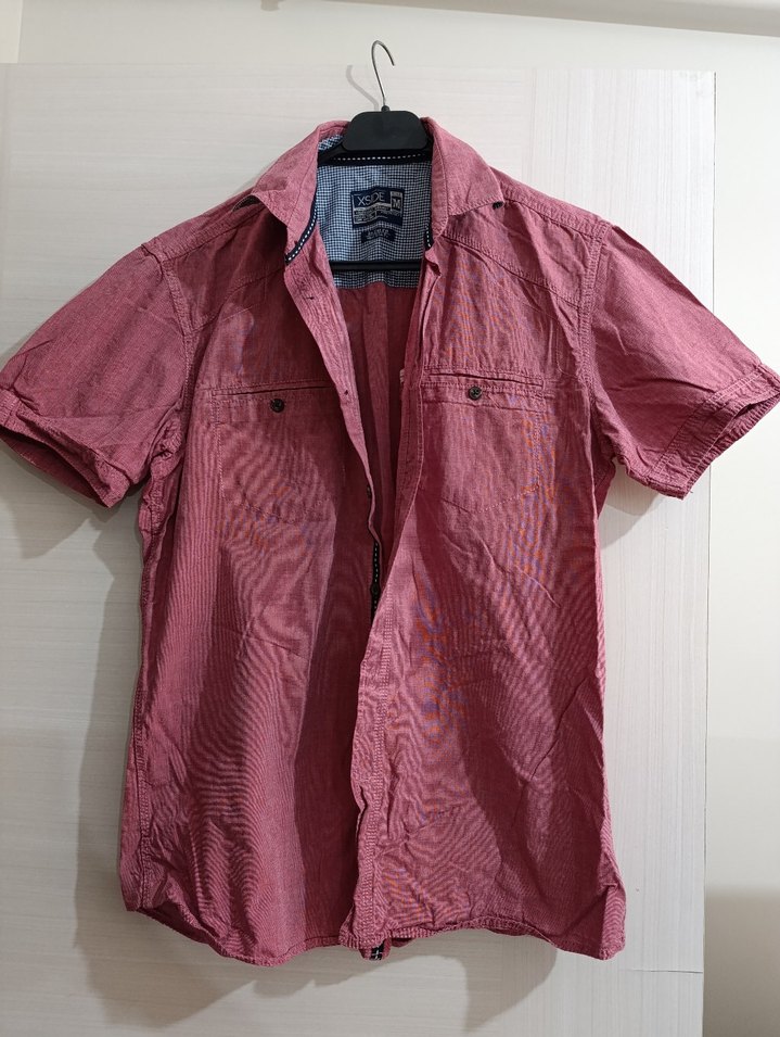 Bordo renkli, pamuk kumaştan yapılmış, düğmeli ve kısa kollu erkek gömleği. Normal boyda, regular fit kesime sahip, günlük kullanıma uygun.Bir kaç kere kullanıldı hiç bir sorunu defosu yok