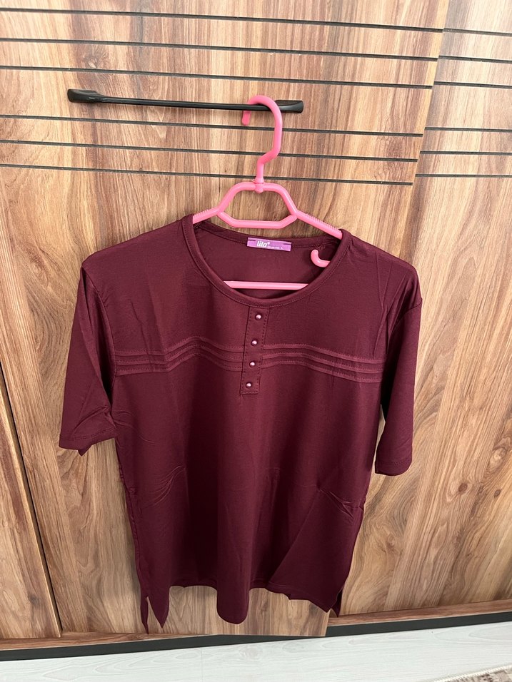Bordo renkli, kısa kollu ve düğmeli tasarıma sahip pamuklu kadın bluz. Normal boy ve rahat kesim ile günlük kullanıma uygundur.