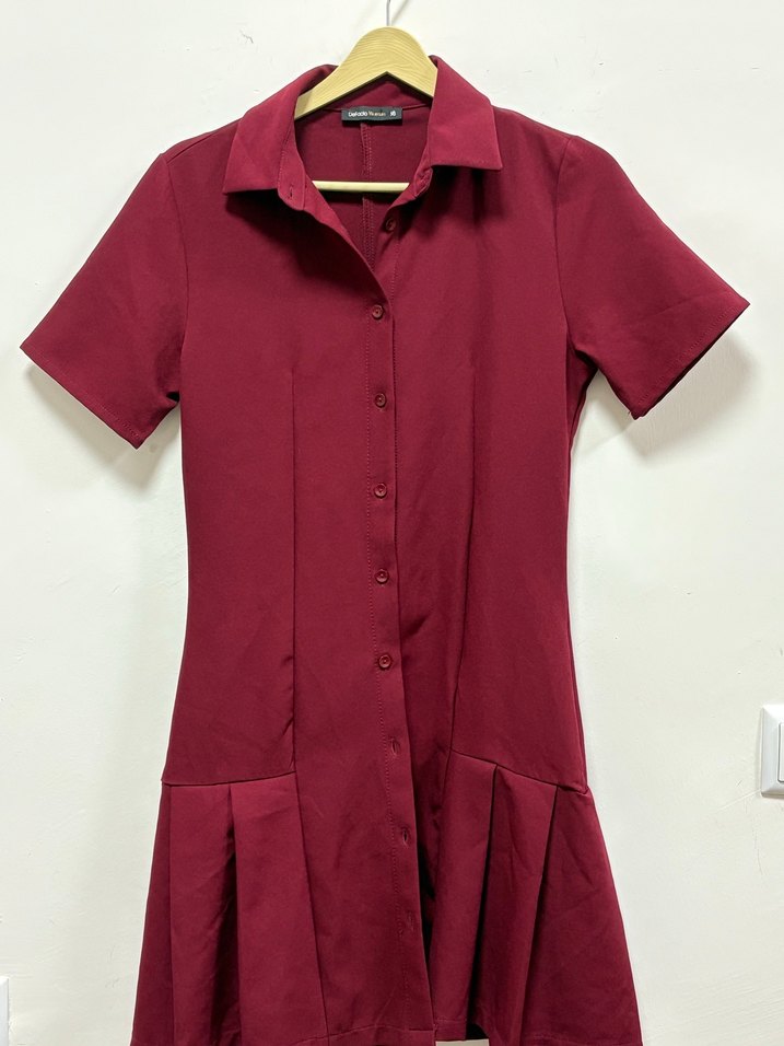 Bordo renkli midi elbise, kısa kollu ve yakalıdır. Düğmeli ön kısmı ve regular kesimiyle ofis için uygundur. Sentetik kumaştan üretilmiştir.