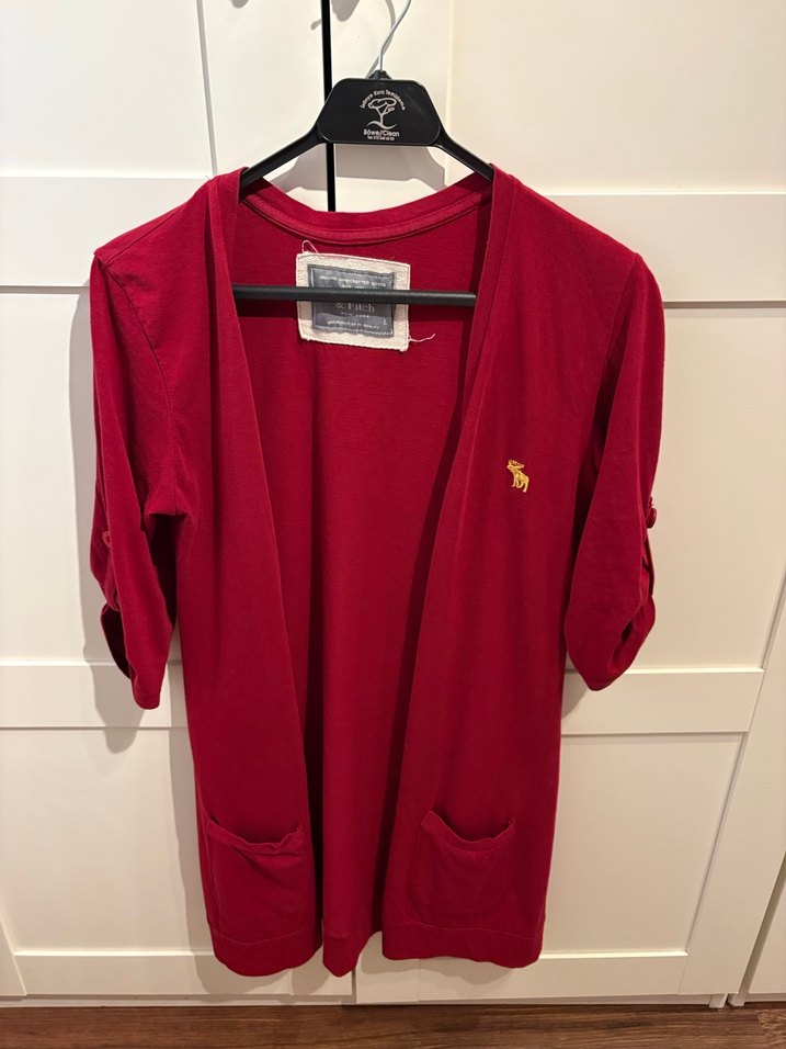 Bordo renkli, kısa kollu, düğmeli ve notched lapel yakalı midi hırka. Rahat kesimi ve parlak dokusuyla günlük kullanıma uygun bir üründür.
