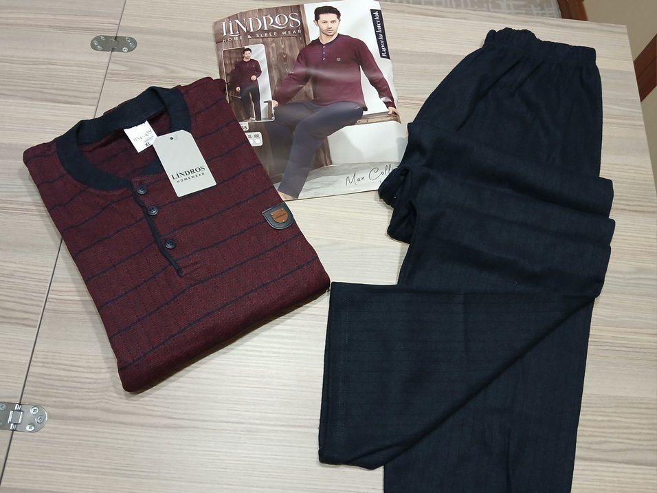 Bordo uzun kollu, düğmeli ve V yaka üst ile koyu renkli, regular fit pantolonlu erkek pijama takımı. Baskılı tasarım sokak stili havası verir. ️BEDENLER M L XL 2XL