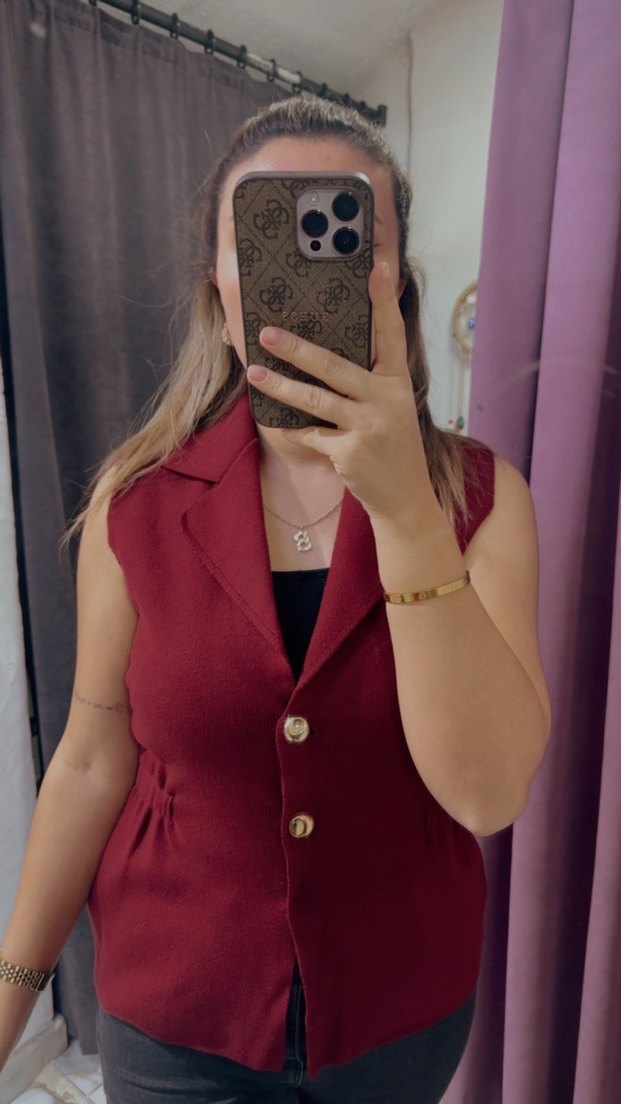 Düğmeli, kolsuz bordo blazer, kesik yakalı ve midi boyda. Sentetik kumaştan, normal kesim ve rahat kullanım sağlar. Ofis ve günlük sokak stiline uygundur.