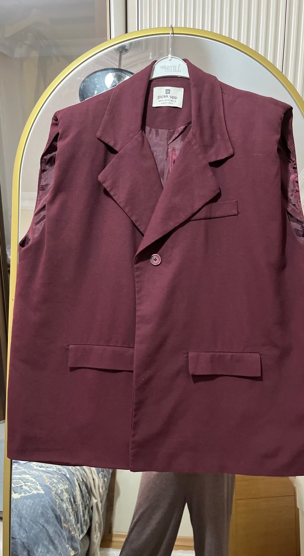 Bordo renkli, kolsuz ve düğmeli midi ceket. Notched lapel yakaya sahip, regular kesim ve sentetik kumaştan üretilmiştir. Ofis kullanımı için uygundur.