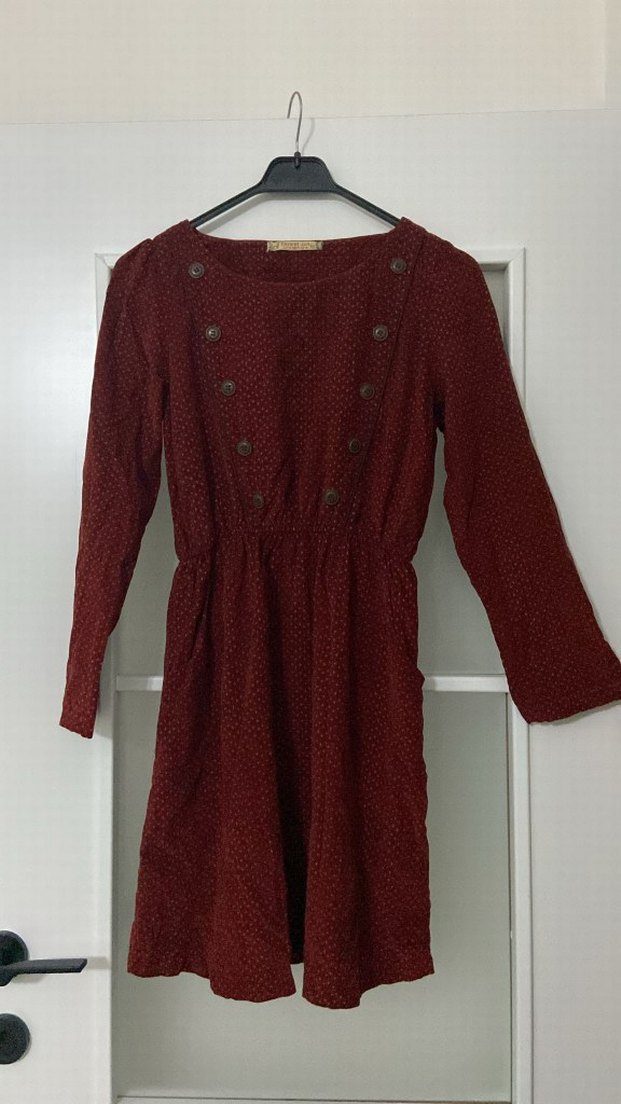 Bordo renkli, uzun kollu ve yuvarlak yakalı midi elbise. Yün kumaştan, düğme detaylı, bol kesim ve vintage bohem tarzında. Günlük kullanım için uygun.