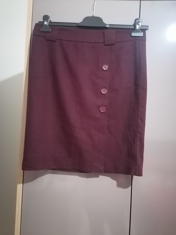 Bordo renkli, düğmeli ön kısmı ve normal kesimi olan hamile eteği. Sentetik kumaştan, ofis için uygun midi boyda sade tasarım. Kaşe etek defosu yoktur