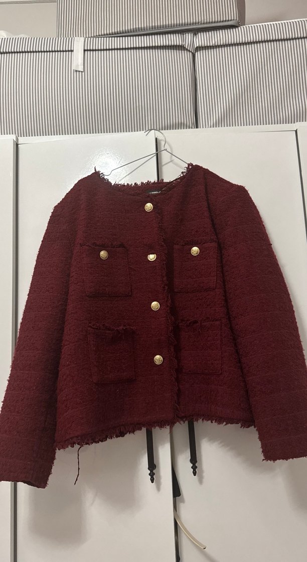 Bordo renkli tuvit ceket düğmeli ön ve kesik yakaya sahiptir. Bol kesim, uzun kollu ve midi boydadır, günlük kullanıma uygundur. ✨