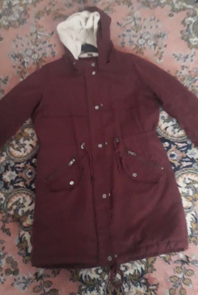 Bordo renkli, düğmeli, uzun kollu, notched lapel yakalı kadın ceket. Rahat kesim, midi boy ve yumuşak, sıcak tutan kumaştan. Sokak stili için uygun