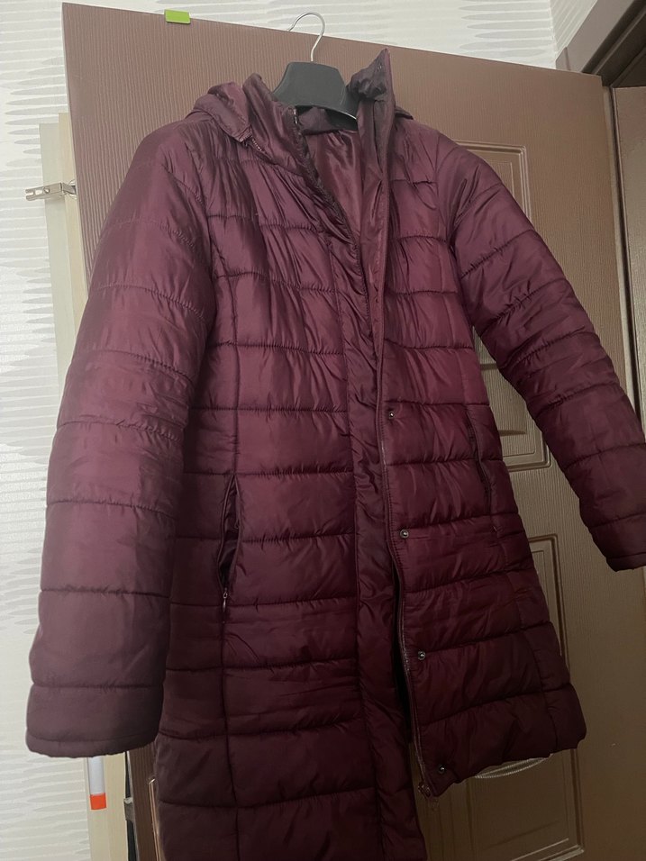 Bordo renkli, düğmeli ve kesimli kadın kışlık mont. Notlu yakası ve uzun kolları ile günlük rahat sokak stili için uygundur. Sadece fermuar sıkıntılı yep yeni