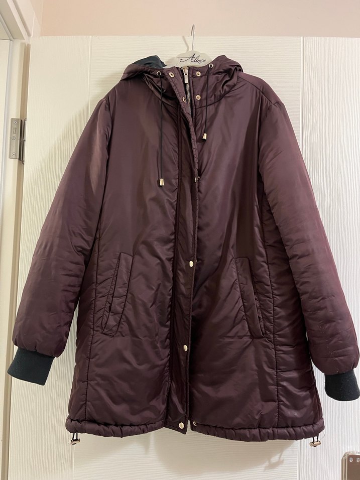 Bordo renkli kadın mont, düğmeli ön ve kesik yaka detayına sahiptir. Uzun kollu ve yumuşak kumaştan üretilmiştir. Herhangi bir sorunu yoktur.