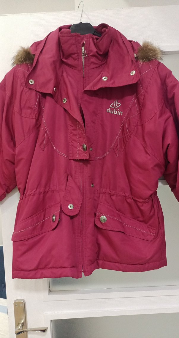 Bordo renkli, düğmeli, notched lapel yakalı, uzun kollu, parlak sentetik kumaştan midi boy kadın mont Gevşek kesimi ve baskılı deseniyle dış mekanlarda rahat kullanıma uygundur. "Dubin" markası göğüste işlenmiştir.
