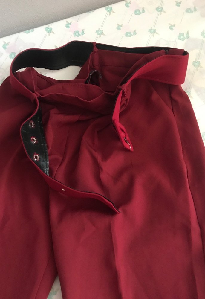 Bordo renkli, düğmeli ve midi boyda kadın pantolon. Gevşek kesimi ve parlak sentetik kumaşıyla günlük kullanıma uygundur, Paris sokak modasına uygun. Bedeni L/XL