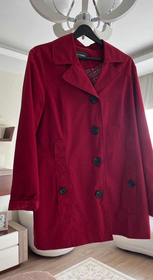Bordo renkli kadın trençkot, notched lapel yakalı ve uzun kolludur. Gevşek kesim, midi boy ve parlak sentetik kumaştan üretilmiştir. Düğmeli kapama ve ofis kullanımı için uygundur.