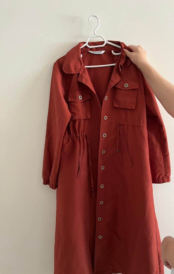 Bordo renkte, keten kumaştan, düğmeli, uzun kollu, notched yaka ve bol kesime sahip midi uzunlukta kadın trençkot. Minimalist ve günlük sokak stili için uygundur.
