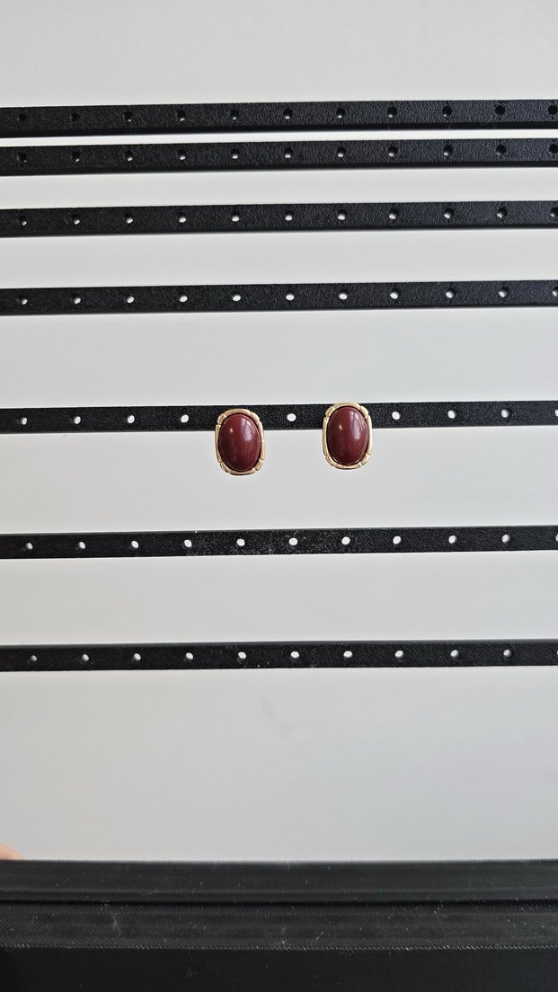 Bordo düğmeli midi küpeler, minimalist ve koyu puantiyeli desene sahip, romantik buluşmalar için uygun.