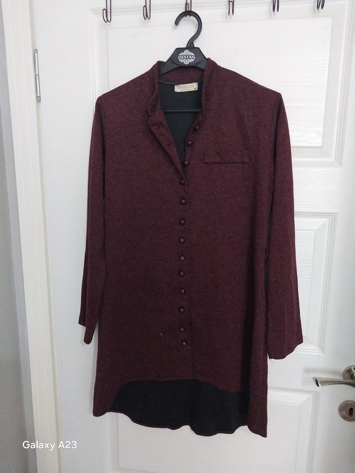 Bordo renkli, yün kumaştan yapılmış, uzun kollu ve düğmeli hamile kaban. Notlu rever yakası ve rahat kesimi ile ofis için uygundur.