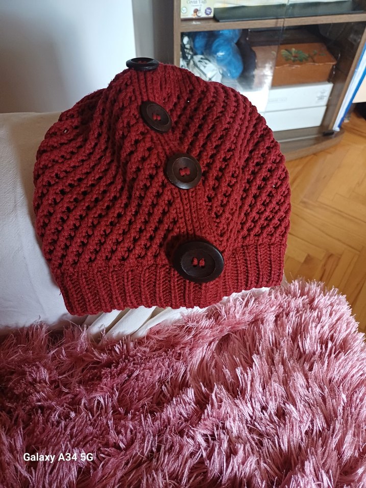 Bordo renkli, üç büyük düğmeli örgü kadın bere. Rahat ve renkli, eski tarz kontrakültür görünümü sunar.