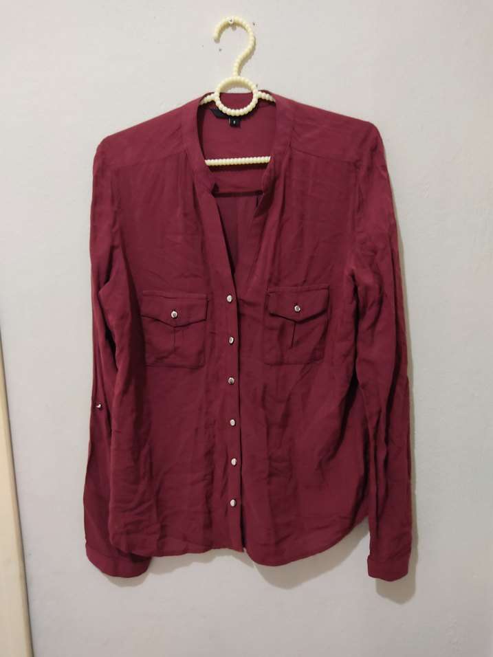 Bordo renkli, penye kumaştan yapılmış kadın gömlek. Düğmeli önü, yakalı ve uzun kollu, bol kesim ve normal boyda, günlük kullanım için uygun.