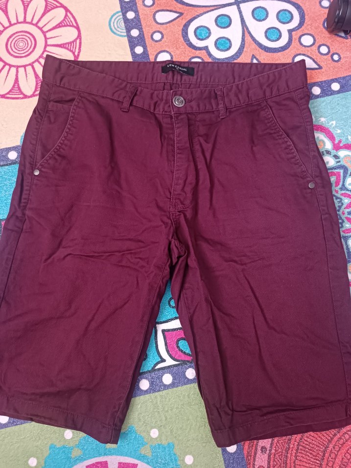 Bordo renkli, düğmeli ve rahat kesim erkek bermuda şort. Yumuşak sentetik kumaştan, günlük kullanım için uygun sokak stili.